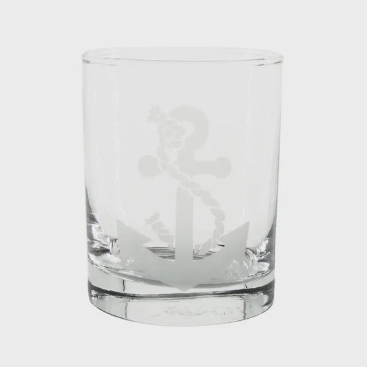 Anchor Etched Rocks Glass; Clear Glass; Etched Anchor Design; Heavy-Base Whiskey/Cocktail Glass; Single.