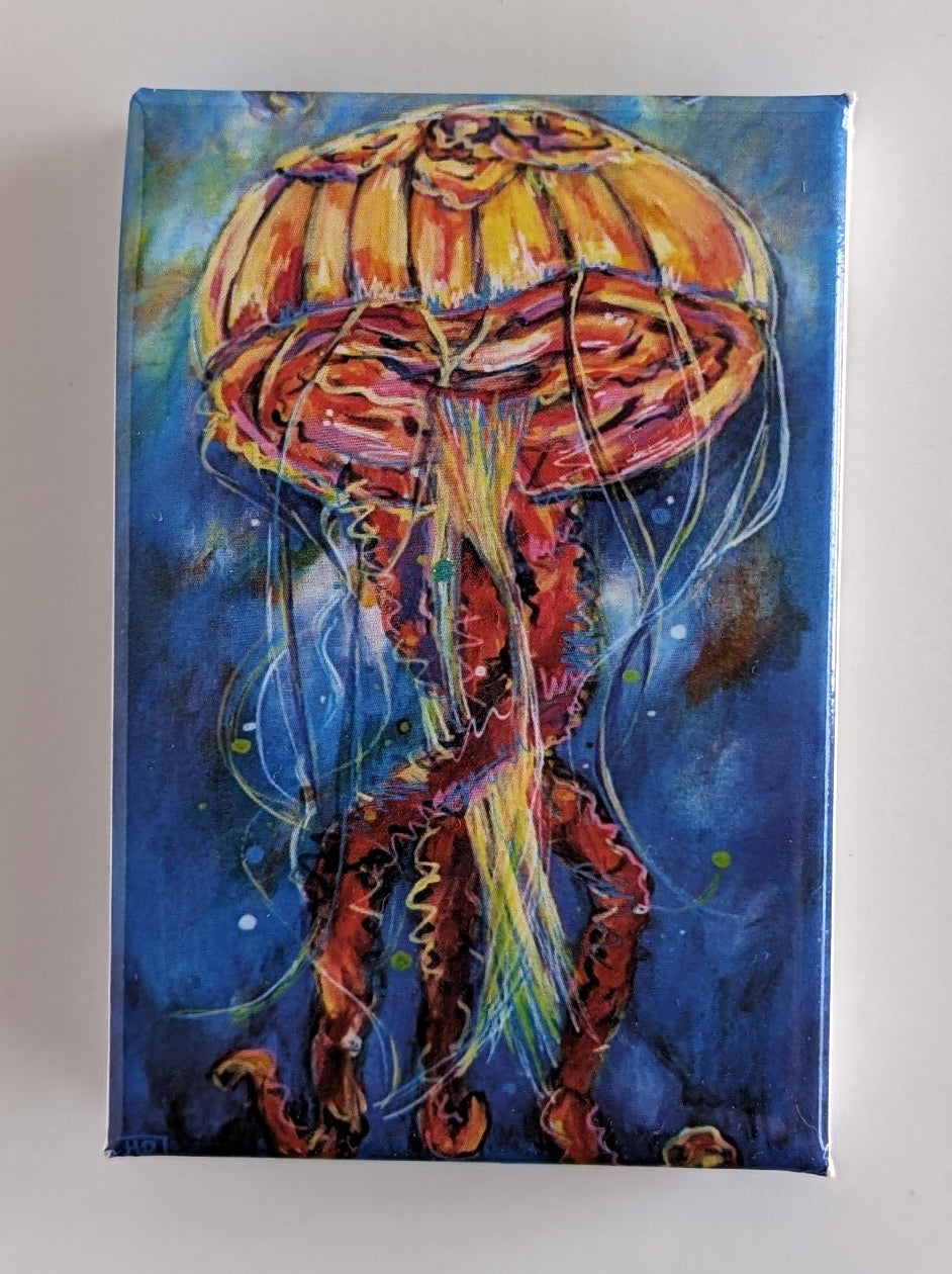 Jellyfish are one of the most fascinating creatures in the sea. Their graceful, otherworldly beauty has inspired artists and poets for centuries. This hand-painted jellyfish magnet is a beautiful way to bring a touch of the sea into your home. The artist has captured the jellyfish's delicate beauty in her painting, and the magnet is made of high-quality materials that will last for years to come. Whether you're a fan of jellyfish or you just appreciate beautiful art, this magnet is a must-have for your collection.